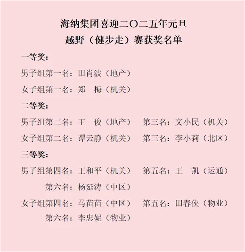 活動(dòng)在熱烈的氣氛中落下帷幕。本次越野(健步走)競(jìng)賽活動(dòng),不僅讓廣大職工在繁忙的工作當(dāng)中得到了放松,還展現(xiàn)出海納職工奮發(fā)進(jìn)取的精神風(fēng)貌。相信在之后的工作中,大家會(huì)以更加飽滿的精神狀態(tài)和更加高漲的工作熱情,為企業(yè)高質(zhì)量發(fā)展再接再厲,貢獻(xiàn)更多力量。